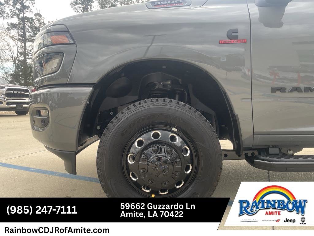 Quick Order Package 24Z Big Horn. Max Tow Package. Night Edition. Big Horn Level 1 Plus Equipment Group: Google Android Auto; SiriusXM Radio Service; For Details Visit DriveUconnect.com; For More Info. Call 800-643-2112; Integrated Voice Command with Bluetooth; Emergency Vehicle Alert System (EVAS); 12" Touchscreen Display; Glove Box Lamp; Auto Power-Folding Mirrors; Footwell Courtesy Lamp; Mirror Running Lights; MOPAR Deployable Bed Step; Alexa Built-In; Apple CarPlay; Power-Adjustable Convex Aux Mirrors; Forward and Reverse Utility Lights; Locking Lower Glove Box; Remote Start System; 9 Alpine Speakers with Subwoofer; Disassociated Touchscreen Display; Dual Glove Boxes; 2nd Row in Floor Storage Bins; Rear View Auto Dim Mirror; Rear Dome with On/off Switch Lamp; LED Bed Lighting; Connectivity - US/Canada; GPS Navigation; 4G LTE Wi-Fi Hot Spot; GPS Antenna Input; Exterior Mirrors with Heating Element; SiriusXM with 360L; Global Telematics Box Module; Connected Travel and Traffic Services; Foam Bottle Insert (door Trim Panel); Black Exterior Mirrors; Big Horn Instrument Panel Badge; Off-Road Information Pages; Selectable Tire Fill Alert; Trailer Tow Pages; HD Radio; Uconnect 5 Navigation with 12.0" Display Radio; Power Heated Fold Telescopic Mirrors; Exterior Mirrors with Supplemental Signals; Steering Wheel Mounted Audio Controls; Exterior Mirrors Courtesy Lamps; Air Conditioning ATC with Dual Zone Control; MOPAR Spray in Bedliner; Power Adjust Mirrors; Luxury Steering Wheel; Power Telescoping Mirrors. Dual Rear Wheels: Clearance Lamps; 17" Steel Spare Wheel; Box and Rear Fender Clearance Lamps; 6000# Front Axle with Hub Extension; Nexen Brand Tires; 14. 000 Lb GVWR; Rear Wheelhouse Liners. Quick Order Package 2UZ Big Horn. LT235/80R17E Off Road Tires. Painted Flat Cab-Length Side Steps. 5th Wheel/gooseneck Towing Prep Group. MyFlexCare Service Diesel. Premium Cloth Bucket Seats. 50 Gallon Fuel Tank. Remote Start System. Rear Wheelhouse Liners. Clearance Lamps. Power 2-Way Driver Lumbar Adjust. **Equipment listed is based on original vehicle build and subject to change. Please confirm the accuracy of the included equipment by calling the dealer prior to purchase.**